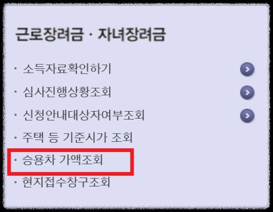 3. 왼쪽에 "근로장려금.자녀장려금" 탭에서 "승용차 가액조회"를 눌러 주세요