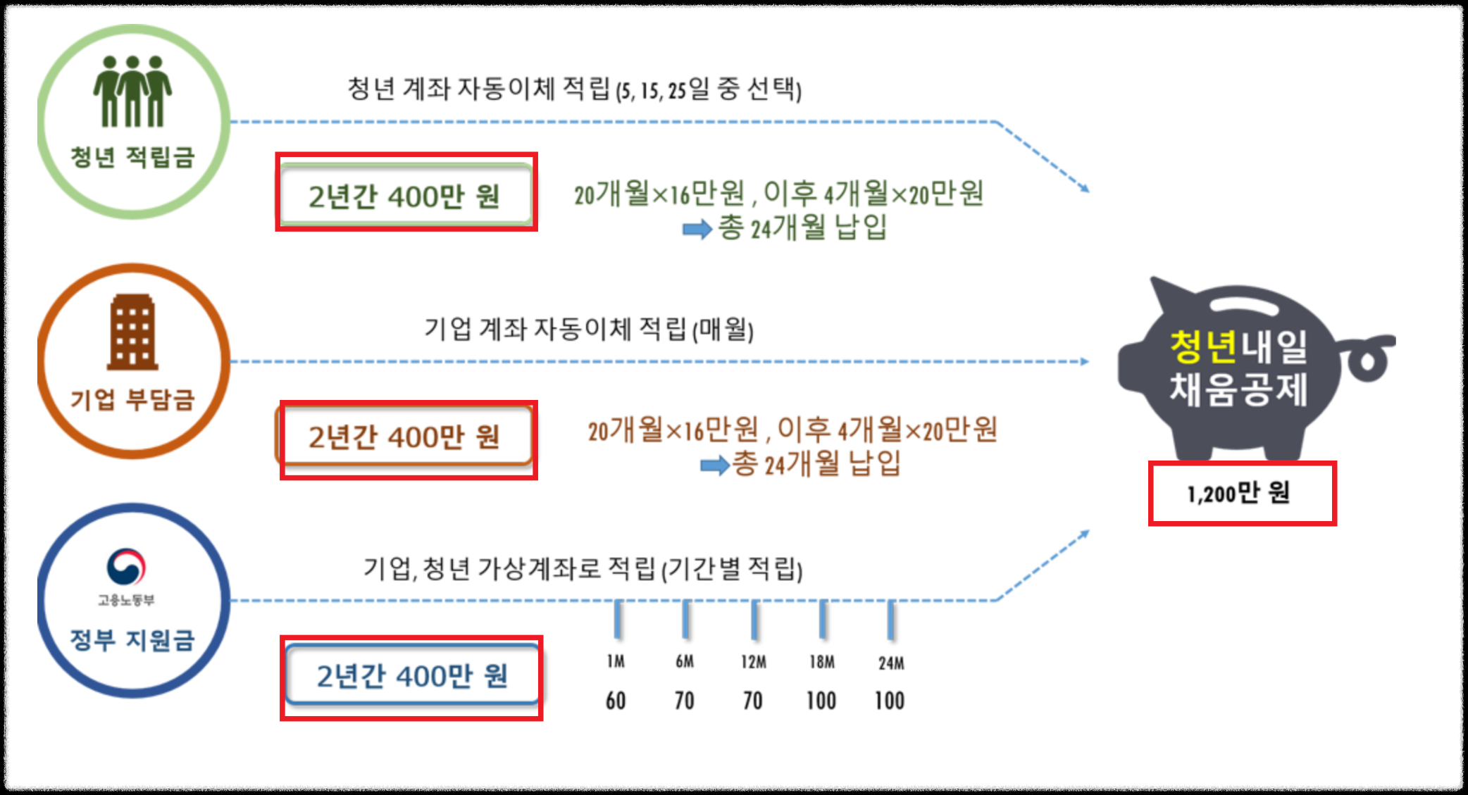 ▶ 청년 본인이 2년간 400만 원(20개월간 16만 원, 이후 4개월간 20만 원)을 적립하면, 기업(400만 원)과 정부(400만 원)가 공동 적립, 2년 후 만기공제금 1200만 원 + 이자까지 더해서 받게 됩니다.